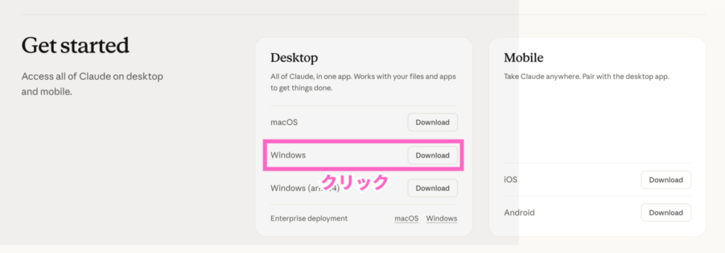 claude.com/download にアクセスすると、OSごとのダウンロードボタンが並んでいます。真ん中の「Windows」ボタンをクリックしてください^^*